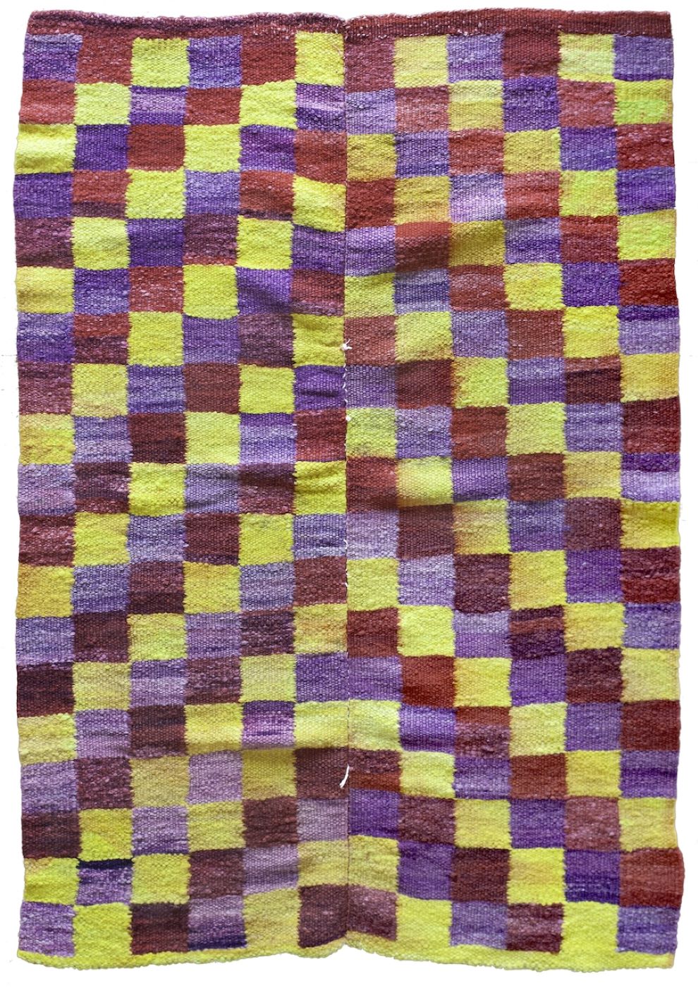 Our own damero is composed of modules that function as units of meaning. In 1967, at the same time as the Hisisa prize, Sonia Delaunay wrote a letter to her assistant in Buenos Aires (whose granddaughter would become my student around 2020) recounting the journey of her works through Argentina. This letter intertwines with works by Alfredo Londaibere, Beto De Volder, Inés Raiteri, Cristina Rochaix, and with Fernanda Laguna’s embroidery placed alongside a baetón—a weft-faced weaving technique emblematic of Santiago del Estero—by an anonymous maker.